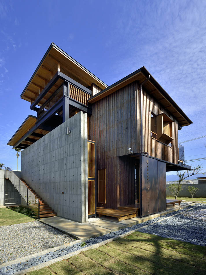 業主很喜歡庭院,因此一樓空間以穿廊與檐廊包圍,每一面都能與院子直通,主要空間是以木窗櫺落地門圍合出來的茶空間,另外緊靠著一道鋼筋混凝土的是工作機具間及浴廁,在西南側檐廊前,設計鋼板拉門片,一方面在颱風季阻隔強勢風雨以保護木造茶屋,另外也在天晴時解決太陽西曬的問題,此外門片之間也製造了由室內觀賞庭院的視覺分割效果。二樓以L型外廊道迎接東側日出,內部以結合廚房、客廳與書房機能的起居空間為主,另有一間推開窗可以看見窗外樟樹的臥室,因為面東南,於是加以木造的風雨窗單元以阻隔風雨進到室內。在隔音與隔熱方面,二樓以浮式地板系統規劃,減少地板的震動音影響一樓空間的使用,屋頂與外牆隔熱系統以穩樂板施作,二樓室內挑高並在外牆以百葉窗加強通風排熱。一二樓間的垂直動線是一支室外梯,利用鋼筋混凝土牆預埋鋼板的懸臂階梯,鋼板踏階之間只有十二公分的高度差,刻意營造出登梯必須放慢腳步的效果。